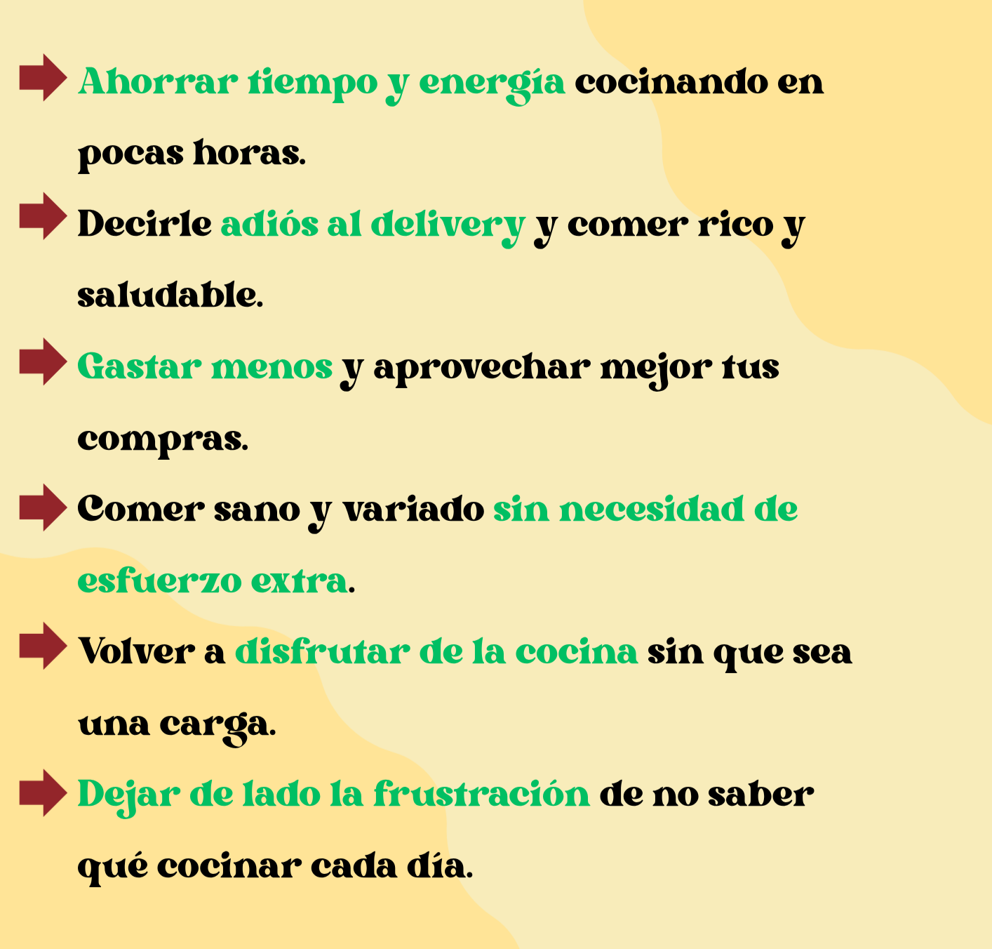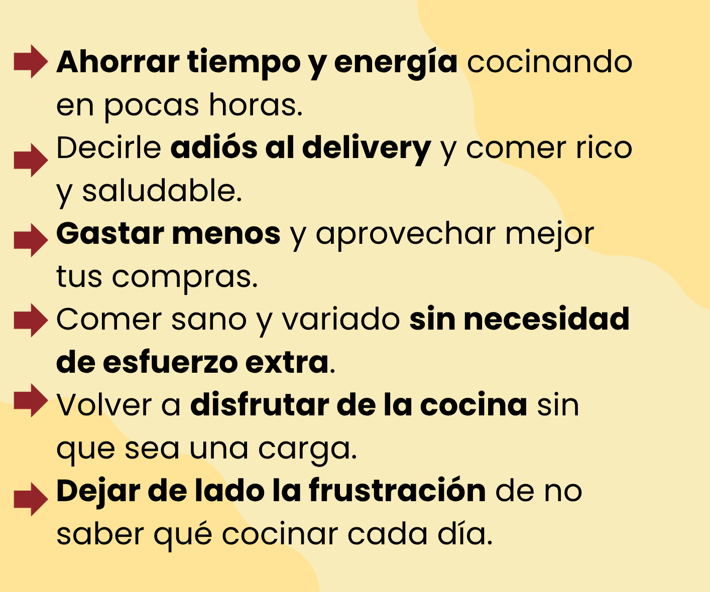 Incluye recetas y tips de organización para que aprendas no solo a cocinar, sino también a planificar tus comidas de manera simple y efectiva.